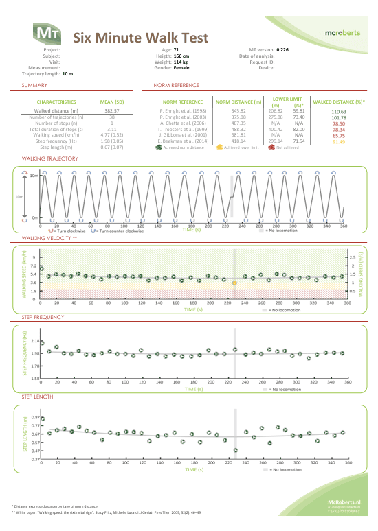Total walking distance is compared against six widely used reference equations, adjusted for age, height, and weight. Results are expressed as a percentage of the norm and color-coded to indicate whether the expected distance was reached.